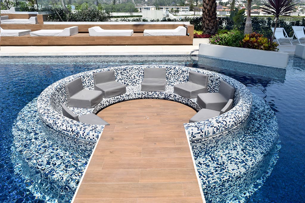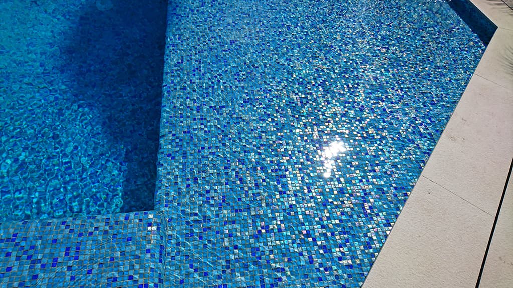 Mosaicos en esfumados o degrades, mezclas y diseños artísticos aplicados a piscinas personalizadas y una amplia gama de colores de línea.